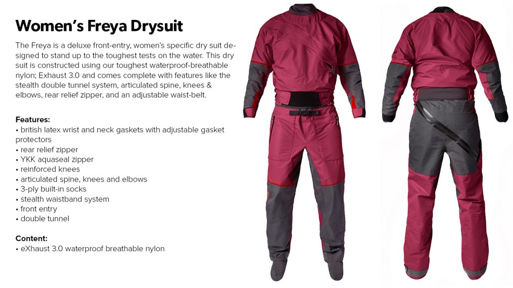 The first product is a all-new Women’s Freya Drysuit. This drysuit is the unique drop-seat relief zipper design allows for easy use and maximum comfort. Constructed with the eXhaust 3.0 fabric and reinforced in the high wear areas for optimum breathability and durability. The front zip entry makes it extremely easy to get in and out of on your own and our new Stealth DCS waistband system locks the suit into place. Plus, fleece-lined pockets for cold days.