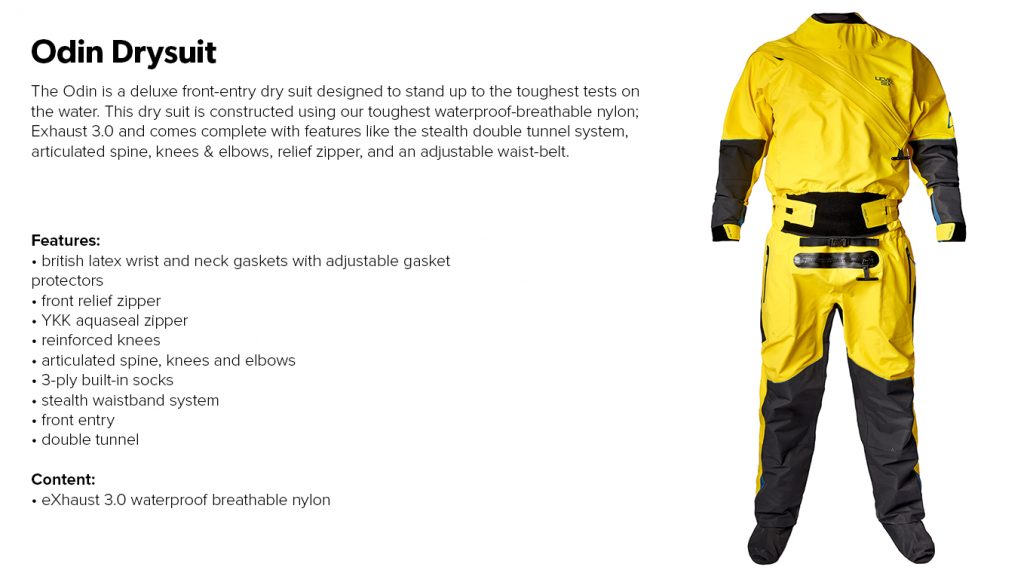 Lastly, the new Odin Drysuit. The Odin is Built from the ground up with an all-new cut and improved fit. Constructed with the eXhaust 3.0 fabric and reinforced in the high wear areas for optimum breathability and durability. The front zip entry makes it extremely easy to get in and out of on your own and the new Stealth DCS waistband system locks the suit into place. Fleece-lined pockets for cold days and a relief zipper for when nature calls.