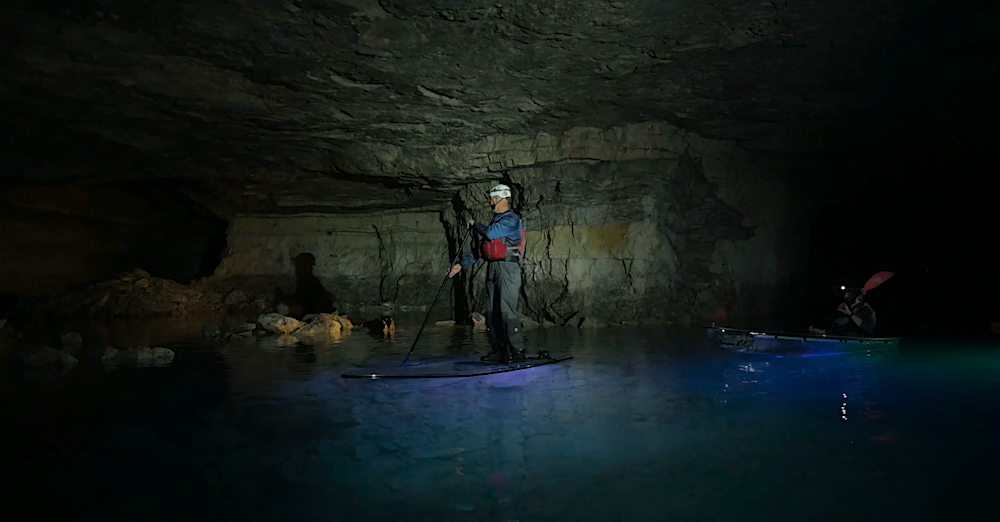 Two hundred feet below ground, Aaron stand-up paddles the serpentine paths made up of over 80 limestone columns in an abandoned mine. “You always go in thinking you’re going to go maybe the exact right path but one or two wrong turns later, and it’s exploring all over again.”