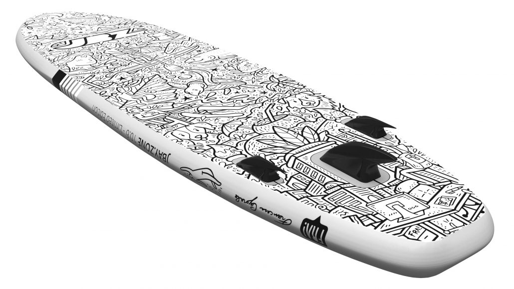 When we talk about Stand Up Paddling we canít ignore the constantly growing popularity that this reinterpretation of classic wave surfing is having all over the world and in Italy in particular. Whether itís a rigid board or an inflatable one, grabbing a SUP is very amusing and relaxing and is also a great workout to stay fit while having fun. The use of a SUP is suitable for everyone without particular skills or abilities required. Since its constitution, JBAY.ZONE makes ´Made in Italyª design its strong point, focusing on distinctive graphics that can characterize its SUPs. For this new Stand up Paddle, available in limited edition for the 2020 season, another step has been taken on the road to exclusivity, signing a collaboration with one of the most popular emerging artists in Italy and Europe: FRA! Design. Among the few Italian Doodle Artists, his expressive ability catches the eye with an easily recognizable style without limits of canvas or contents.