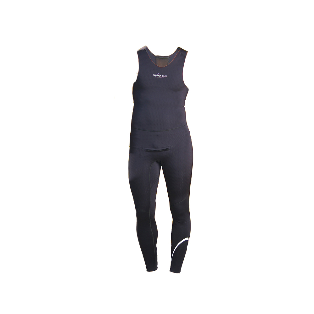 There is regular Neoprene below the knees to protect from the cold water. We gave this product an extra detail, the stretchable net on the back, designed specifically for enabling more freedom of movement in the shoulder area. Wide openings for your arms ensure that your skin won’t chafe on the material while paddling.