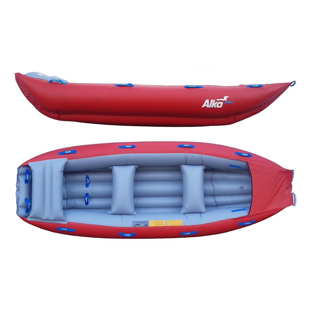 Raft for calmer rivers (inflatable punt). Due to the sliding inflatable seats, the interior space of the Alka is very variable. You can easily create space for several barrels or a group of children. The rear deck is inflatable and allows the guide to sit. Behind the rear deck, there is a gap between the bottom and the seat for easy pouring of water or washing off dirt. The back has footrests at the bottom. There is a handle for tying luggage on the front of the cylinder. At the tip of the boat, there are two rope eyes for towing. There are 2×4 handles on the sides and two more on the back for carrying. Under the forward deck is a bracket for the pump. Alka 5 comfortably accommodates 2 boaters but also takes 5 with luggage.