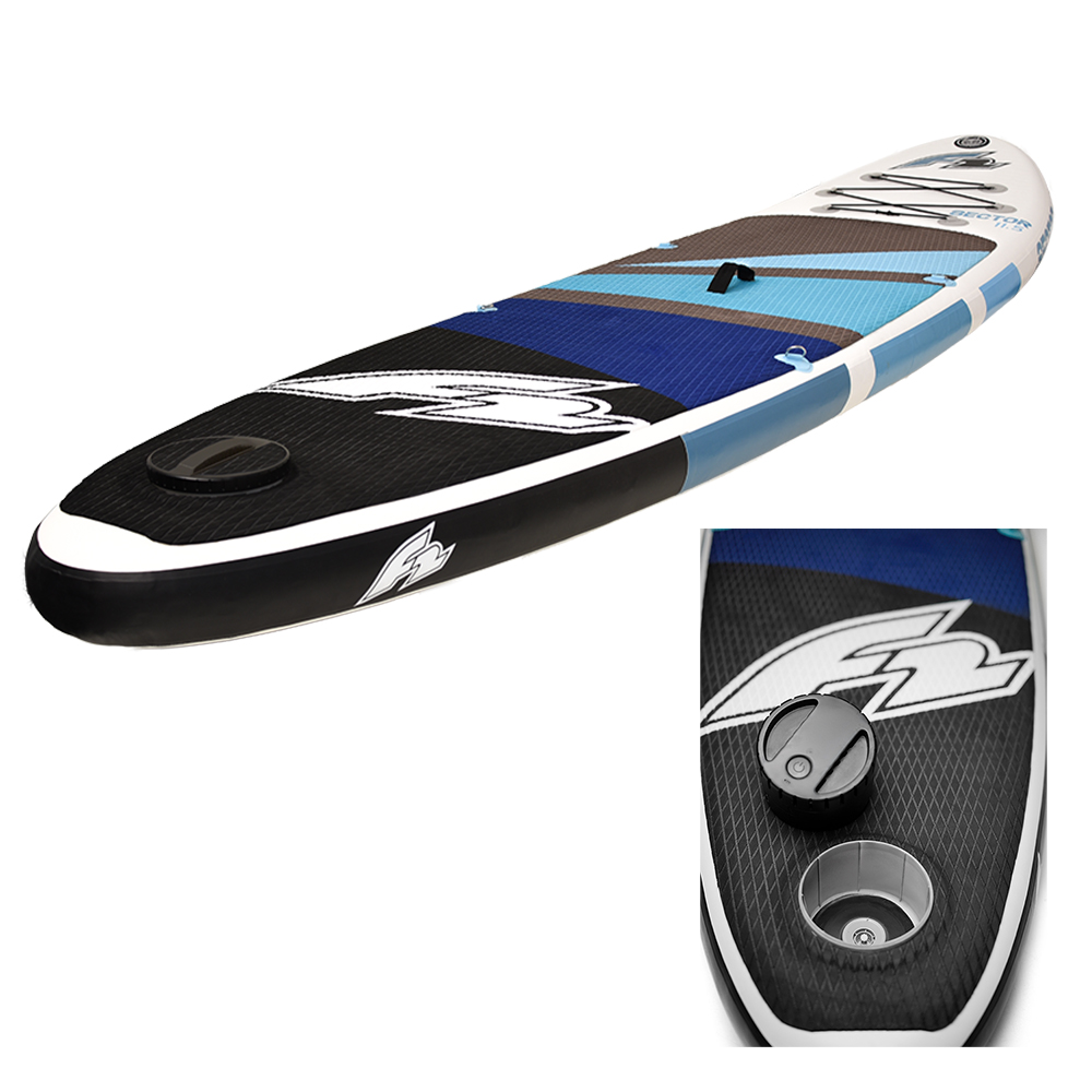 The F2 SUP SMART BOX is a patented, waterproof, integrated storage system that redefines traditional SUP boards. Made from durable plastic, the 15 cm deep round box is seamlessly connected to the drop stitch system and discreetly positioned beneath the EVA pad at the board’s rear. Perfect for day trips, it offers space for valuables, chilled drinks, or sunscreen, all safely secured with a twist-seal lid. The SMART BOX also houses a battery-powered pump, inflating the board in under 10 minutes, with enough charge to inflate two boards. Standard pump connections allow for manual inflation if needed, ensuring easy setup and storage.