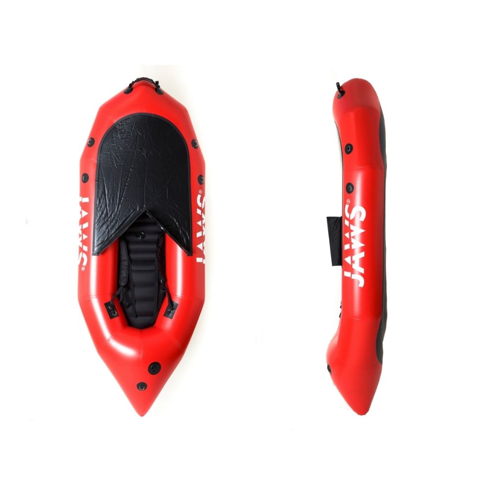 The Minotuare (3.5 kg) is designed for both beginners and river experts. Unlike the ICARE, which is equipped with a pontet, a coaming, and requires the use of a skirt in whitewater, the MINOTAURE has a breakwater (JAWS registered model) which helps prevent water from entering. The water that does is quickly discharged through the self-draining bottom. This breakwater also allows you to carry your bags if you leave on a journey of several days or transport your bike if your adventure carries you between river descent and mountain bike trail. The breakwater will not prevent you from rolling your packraft, transporting, or storing it. The rigid portions of the breakwater are easily removed from their housing before bending.