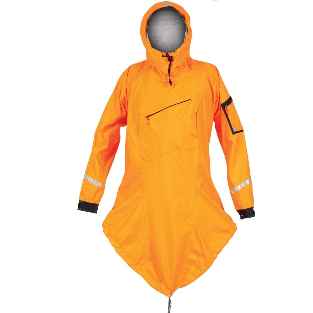 This one-piece combination jacket and spray skirt cover is designed to be worn over existing clothing and life vest in inclement weather on or off the water. This piece also functions in an emergency when needed for extra insulation or when dealing with an injured paddler.