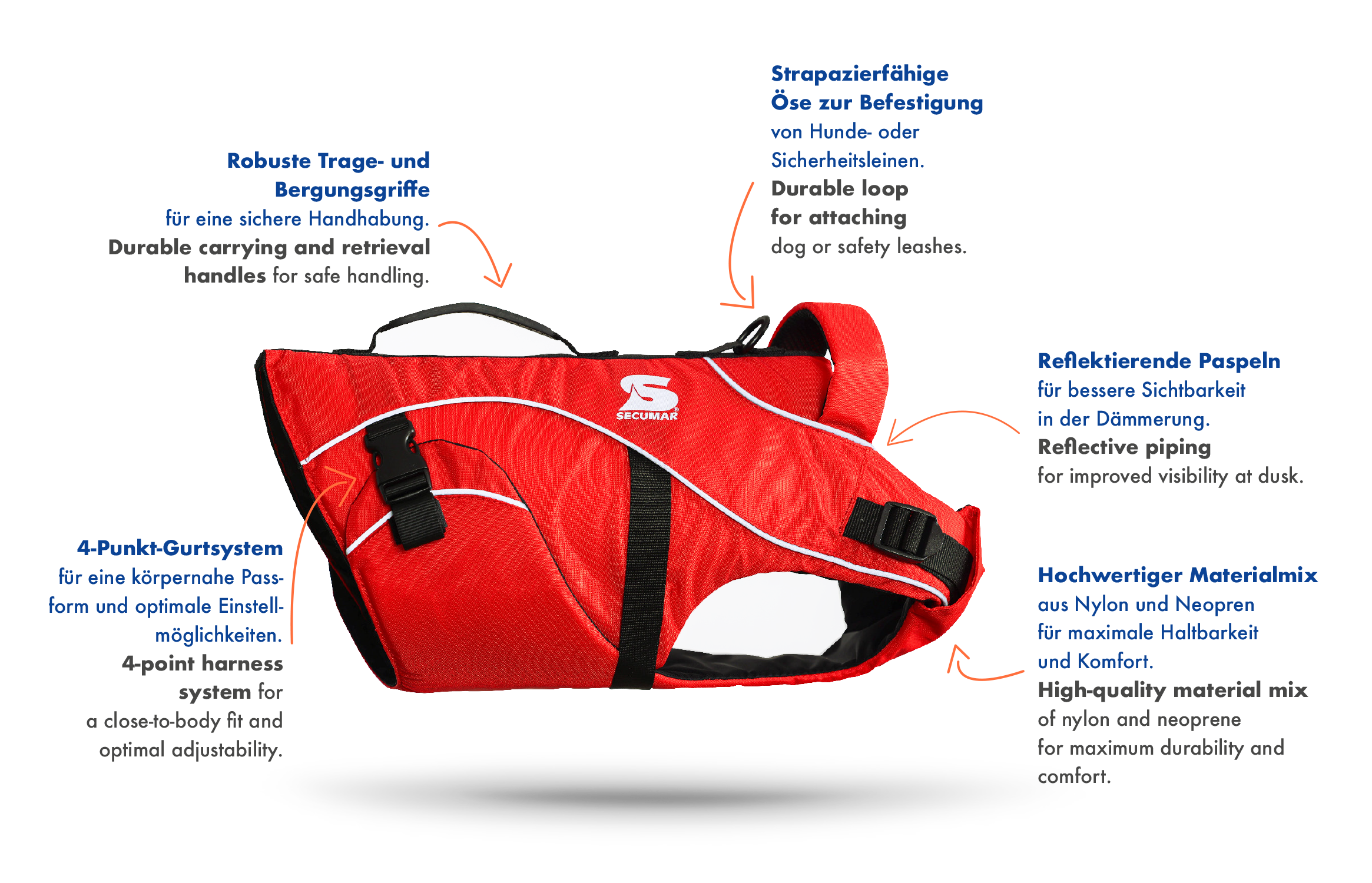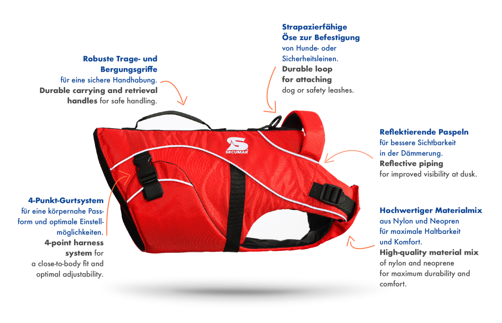 The SECUDOGS swimming vest has been developed not only with safety in mind, but also with comfort in mind – after all, your dog should enjoy wearing the waistcoat at all times. The innovative four-point harness system allows the waistcoat to be perfectly adjusted to the dog’s body and is available in five sizes (XS to XL).A sturdy eyelet for attaching a dog leash or safety leash makes it possible to keep the waistcoat on during a walk by the water – ideal for harbours or jetties where a dog could easily fall into the water.