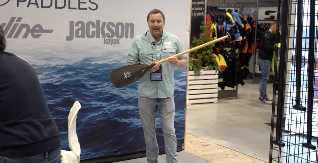 Werner present the Journey, a newer canoe paddle design with a carbon fibre-foam core blade with a triple laminate wooden shaft.
